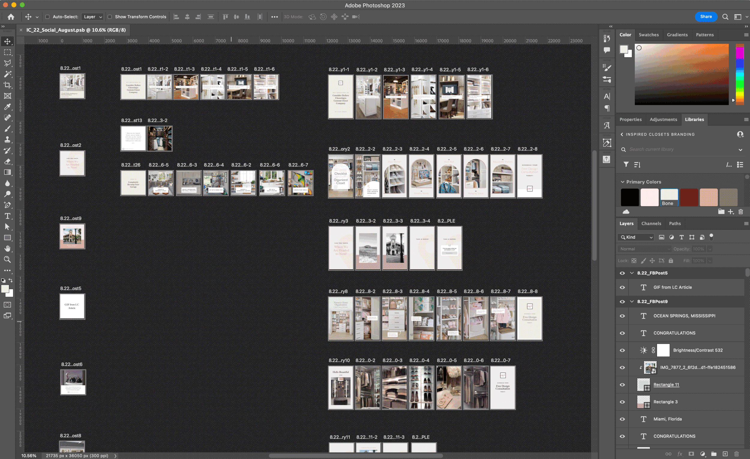 Designing social media content each month for Inspired Closets at a high volume allows me to continually grow the brand’s visual language. Concepts are designed as scalable systems that can work as a post, story, or reel. While designing, it is important to bridge the gap between the sophisticated target audience and remaining on-trend for successful social media engagement. The collection of content I design each month is used for the Inspired Closets national brand and is also utilized by the network of local dealers throughout the U.S. I am responsible for cataloging all of the assets into the DAM bi-weekly for dealers to access and post to their social media accounts.